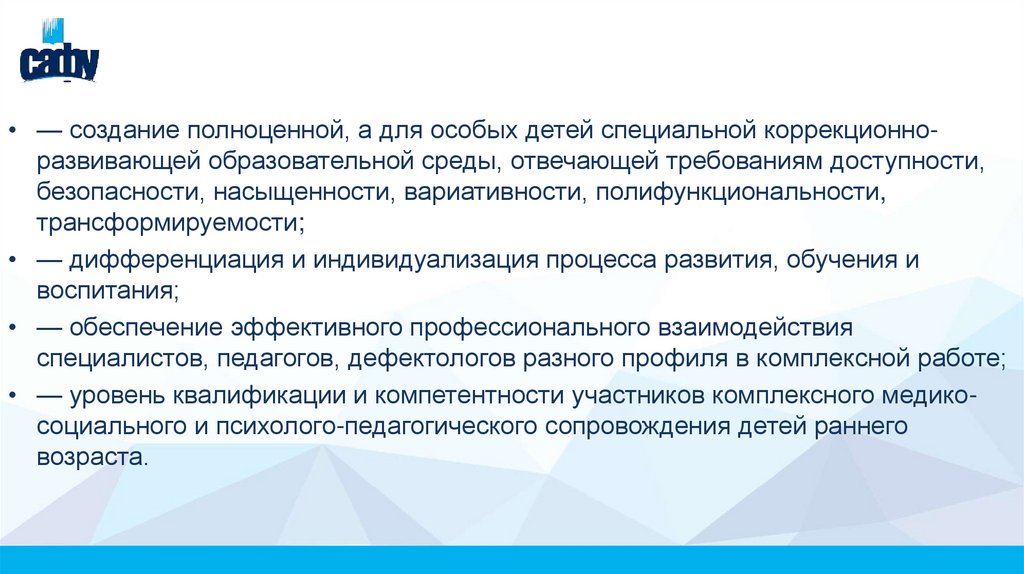 • — создание полноценной, а для особых детей специальной коррекционноразвивающей образовательной среды, отвечающей требованиям доступности,безопасности, насыщенности, вариативности, полифункциональности,