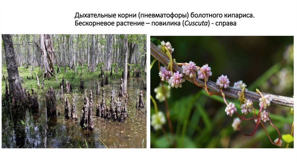 Дыхательные корни (пневматофоры) болотного кипариса.Бескорневое растение – повилика (Cuscuta) - справа