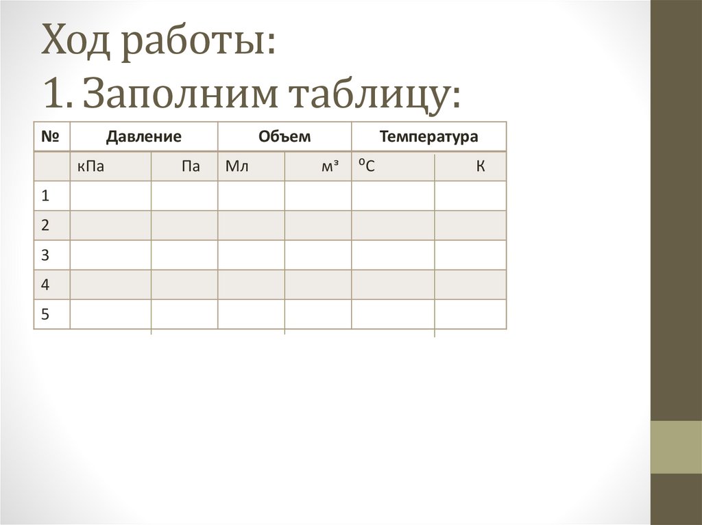 Ход работы:1. Заполним таблицу:
