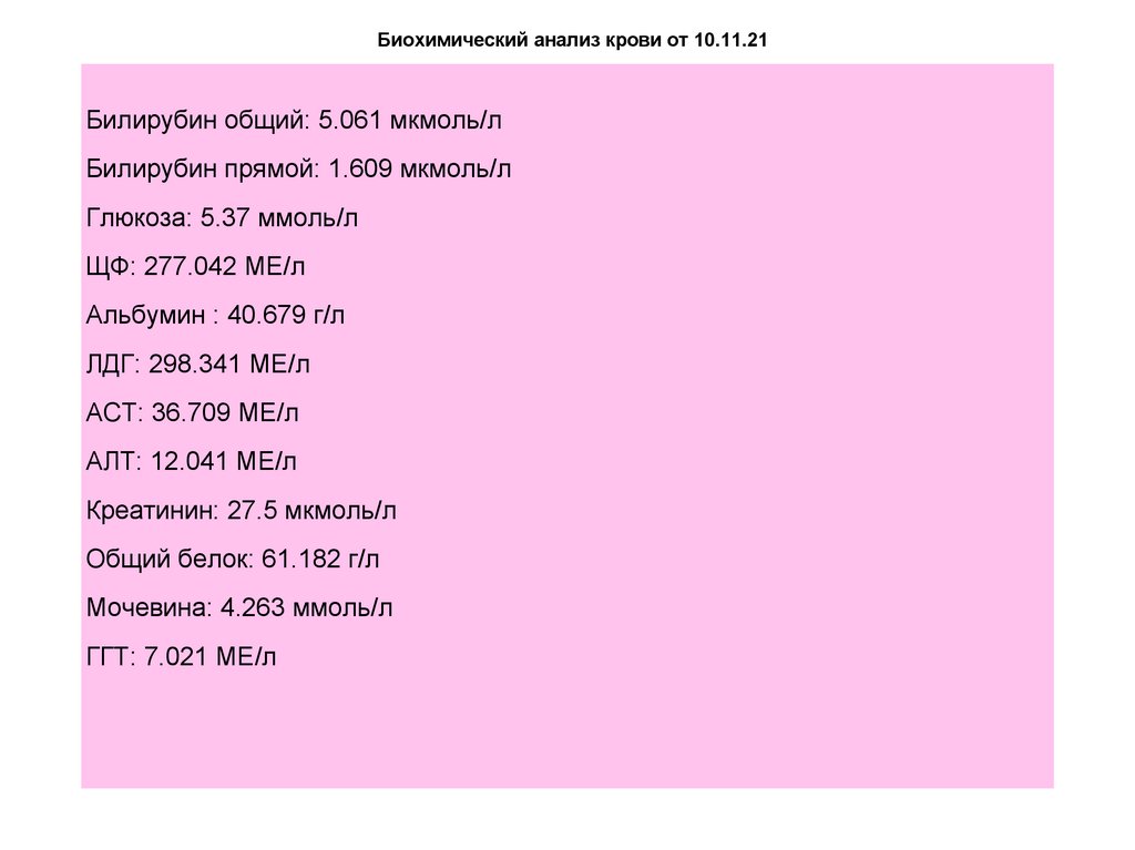 Биохимический анализ крови от 10.11.21Билирубин общий: 5.061 мкмоль/л