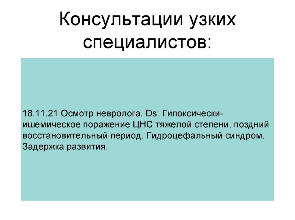 18.11.21 Осмотр невролога. Ds: Гипоксическиишемическое поражение ЦНС тяжелой степени, поздний