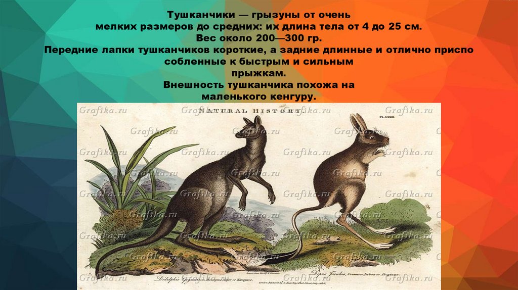 Тушканчики — грызуны от оченьмелких размеров до средних: их длина тела от 4 до 25 см.