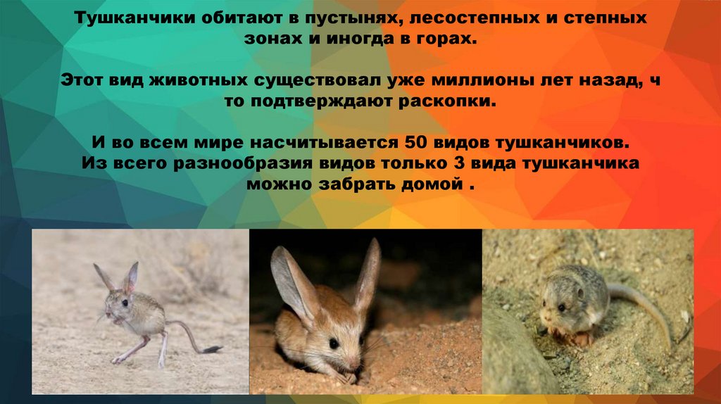 Тушканчики обитают в пустынях, лесостепных и степныхзонах и иногда в горах.