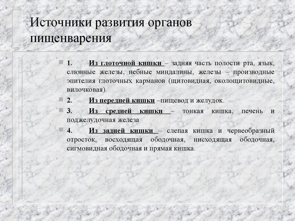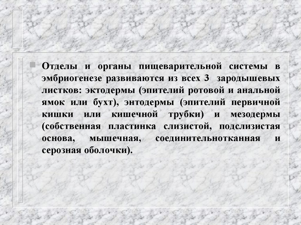 Отделы и органы пищеварительной системы вэмбриогенезе развиваются из всех 3 зародышевых