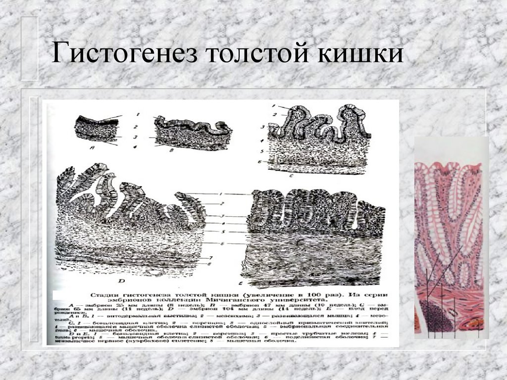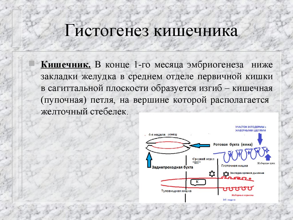 Гистогенез кишечникаКишечник. В конце 1-го месяца эмбриогенеза ниже