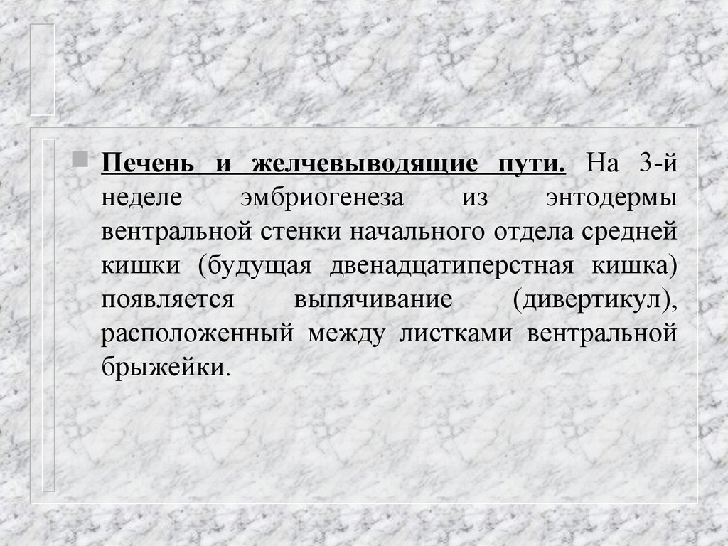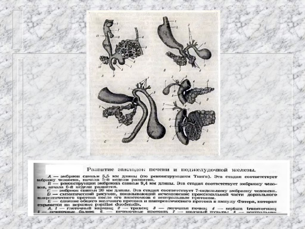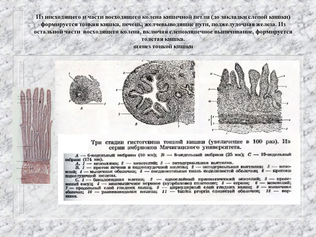 Из нисходящего и части восходящего колена кишечной петли (до закладки слепой кишки)формируется тонкая кишка, печень, желчевыводящие пути, поджелудочная железа. Из