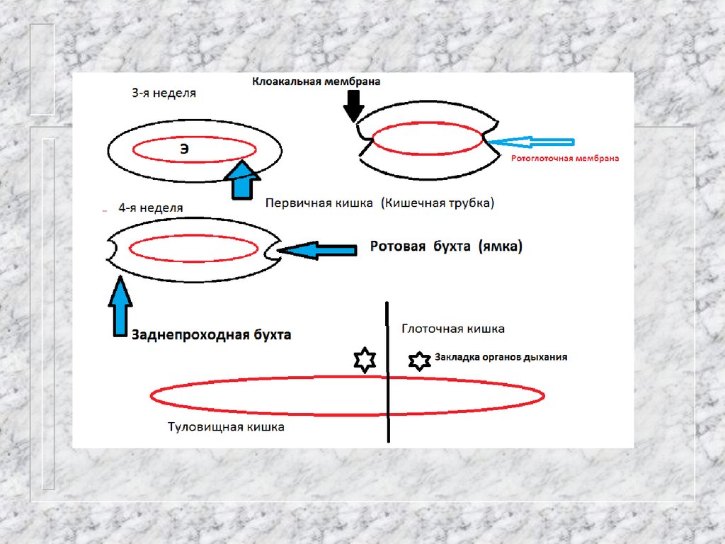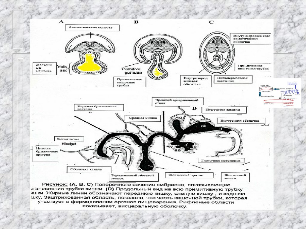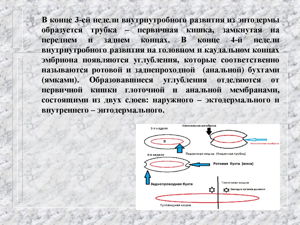 В конце 3-ей недели внутриутробного развития из энтодермыобразуется трубка – первичная кишка, замкнутая на