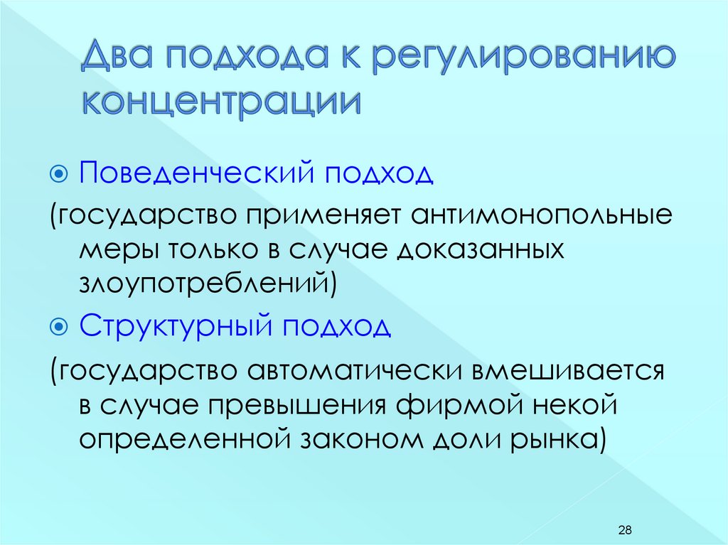Поведенческий подход(государство применяет антимонопольные
