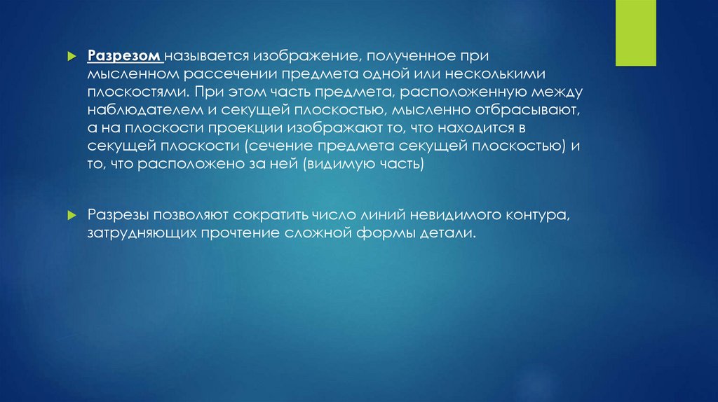Разрезом называется изображение, полученное примысленном рассечении предмета одной или несколькими