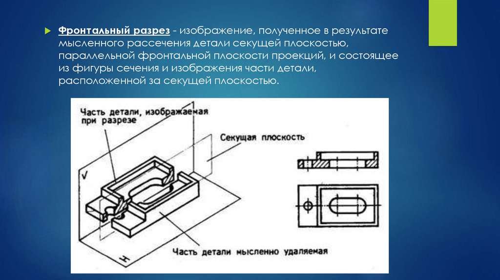 Фронтальный разрез - изображение, полученное в результатемысленного рассечения детали секущей плоскостью,