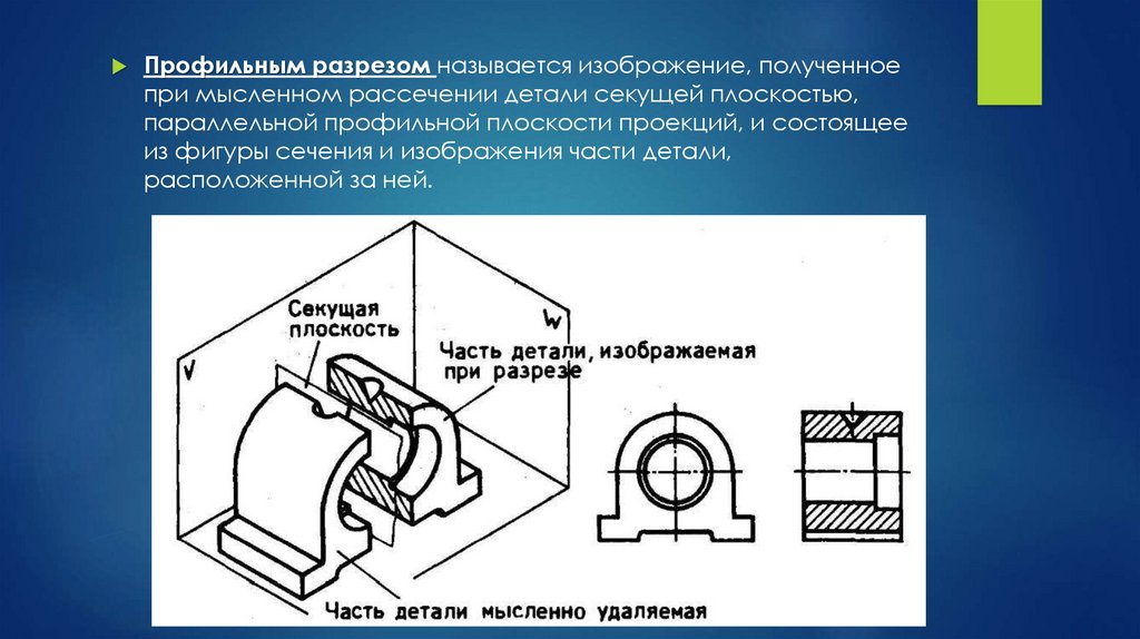 Профильным разрезом называется изображение, полученноепри мысленном рассечении детали секущей плоскостью,