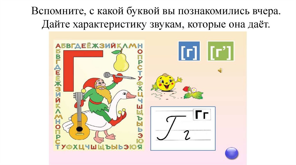 Вспомните, с какой буквой вы познакомились вчера.Дайте характеристику звукам, которые она даёт.