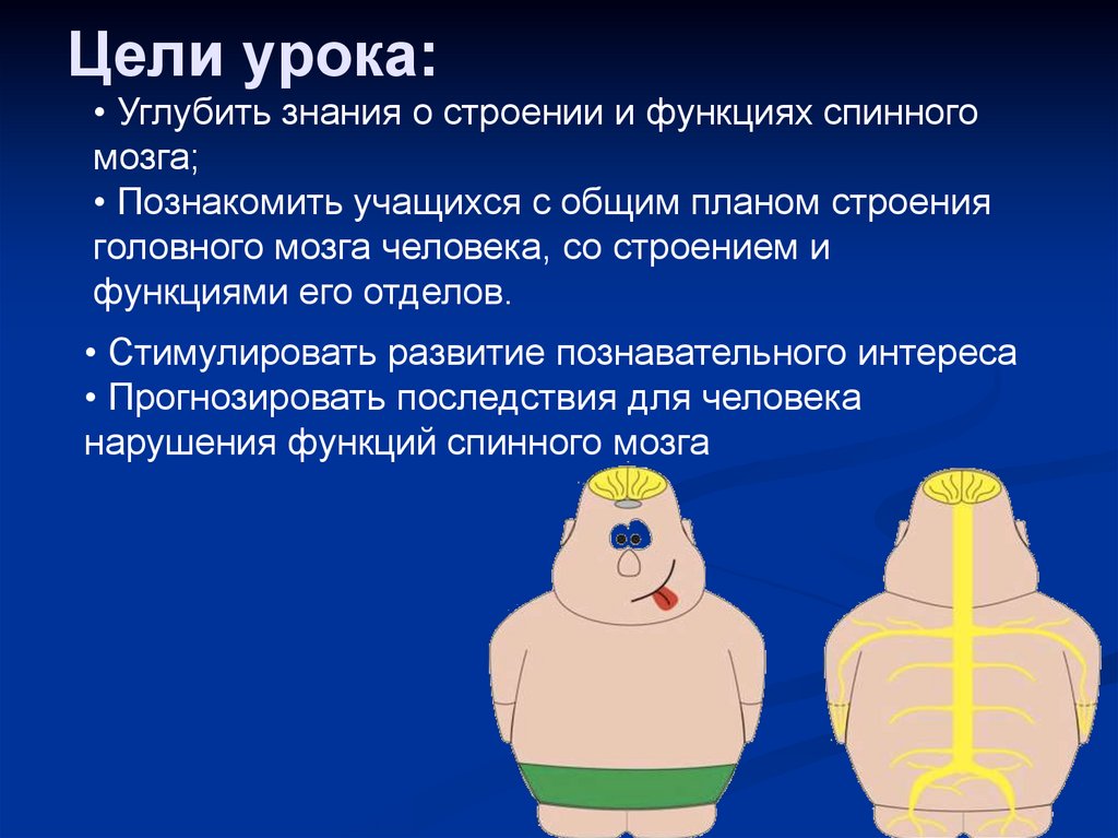 Цели урока:• Углубить знания о строении и функциях спинного