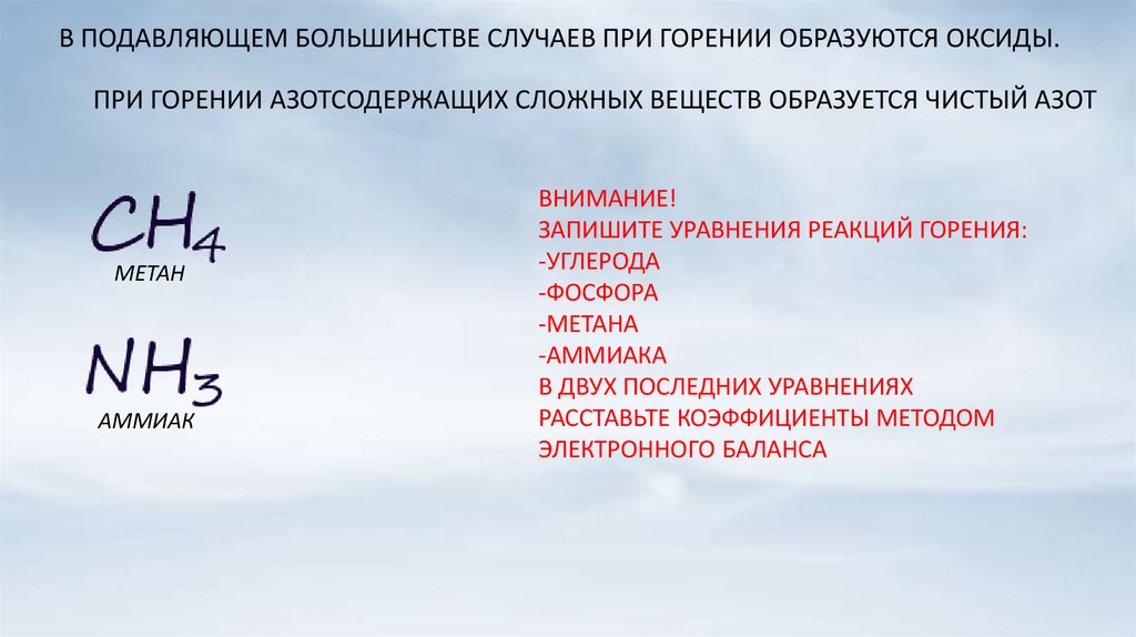 В ПОДАВЛЯЮЩЕМ БОЛЬШИНСТВЕ СЛУЧАЕВ ПРИ ГОРЕНИИ ОБРАЗУЮТСЯ ОКСИДЫ.ПРИ ГОРЕНИИ АЗОТСОДЕРЖАЩИХ СЛОЖНЫХ ВЕЩЕСТВ ОБРАЗУЕТСЯ ЧИСТЫЙ АЗОТ