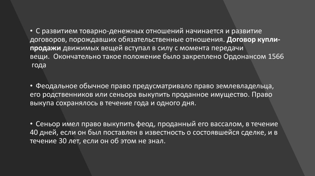 • С развитием товарно-денежных отношений начинается и развитиедоговоров, порождавших обязательственные отношения. Договор куплипродажи движимых вещей вступал в силу с момента передачи