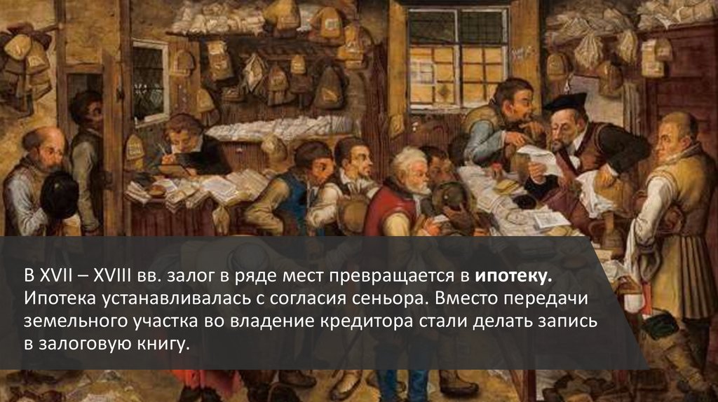 В XVII – XVIII вв. залог в ряде мест превращается в ипотеку.Ипотека устанавливалась с согласия сеньора. Вместо передачи