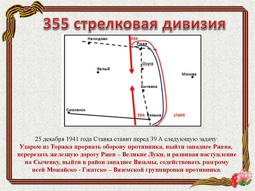 25 декабря 1941 года Ставка ставит перед 39 А следующую задачу:Ударом из Торжка прорвать оборону противника, выйти западнее Ржева,