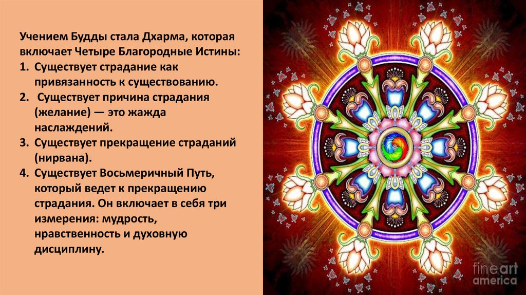 Учением Будды стала Дхарма, котораявключает Четыре Благородные Истины: