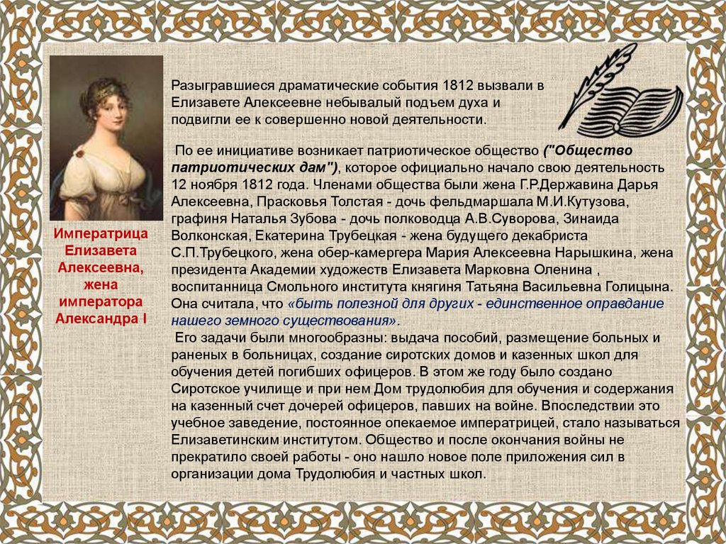 Разыгравшиеся драматические события 1812 вызвали вЕлизавете Алексеевне небывалый подъем духа и