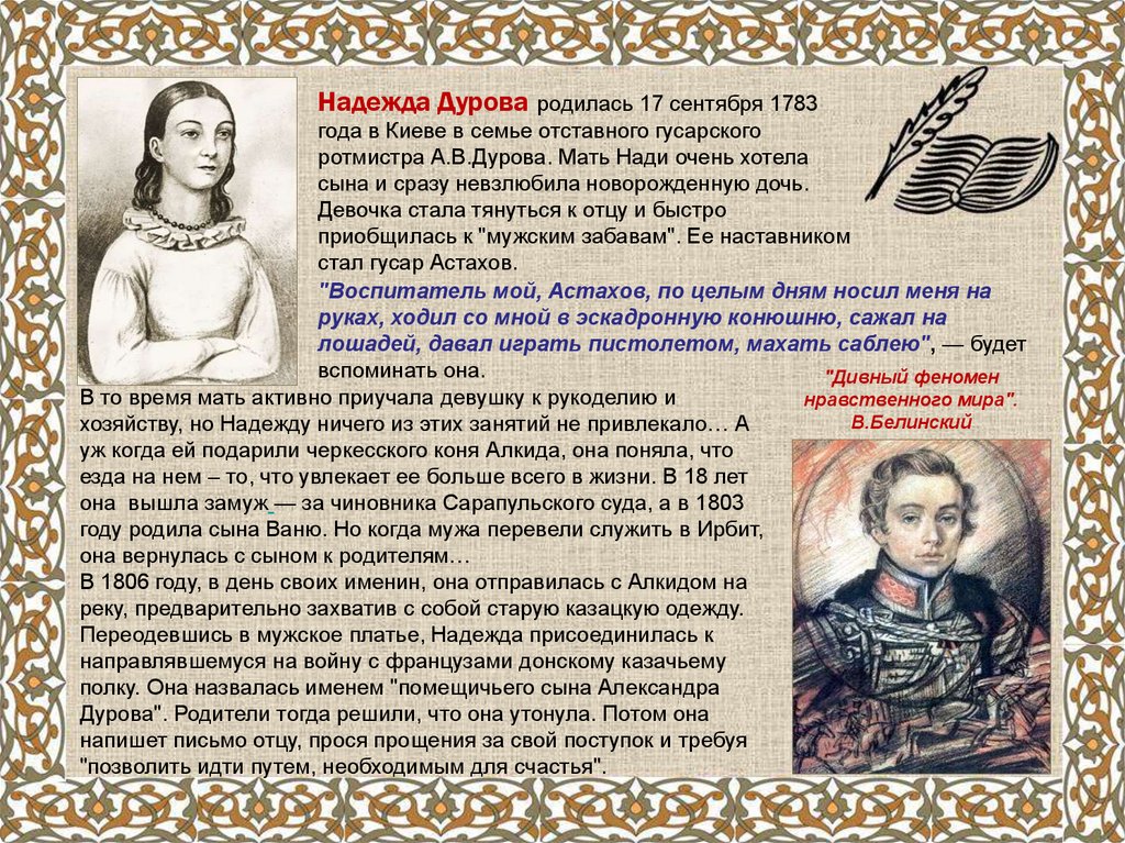 Надежда Дурова родилась 17 сентября 1783года в Киеве в семье отставного гусарского