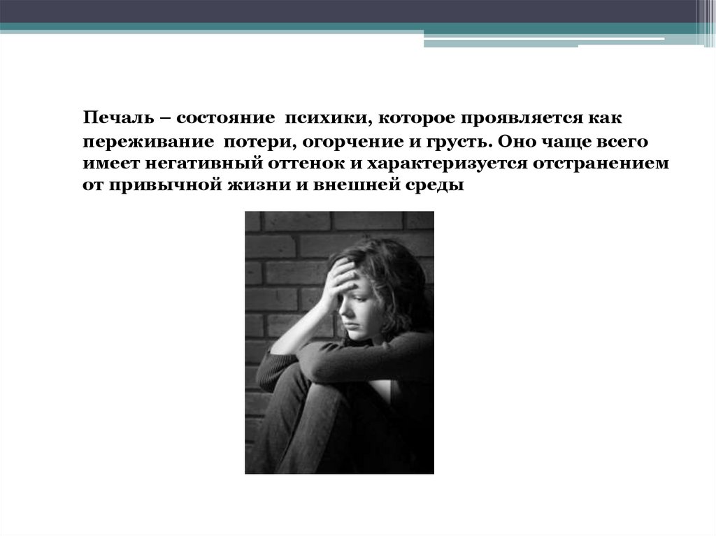 Печаль – состояние психики, которое проявляется какпереживание потери, огорчение и грусть. Оно чаще всего