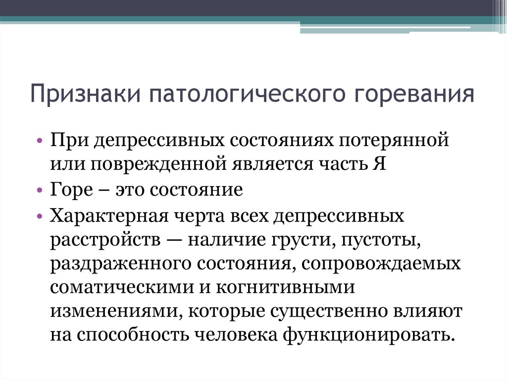 Признаки патологического горевания• При депрессивных состояниях потерянной
