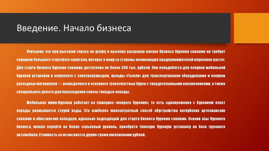 Введение. Начало бизнесаУчитывая, что при высоком спросе на услугу и высоких расценках начало бизнеса бурения скважин не требует