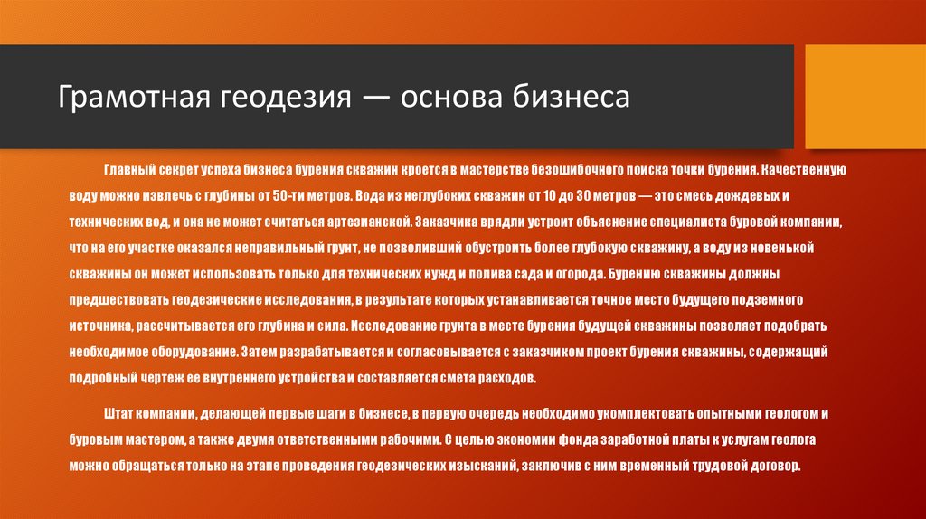 Грамотная геодезия — основа бизнесаГлавный секрет успеха бизнеса бурения скважин кроется в мастерстве безошибочного поиска точки бурения. Качественную
