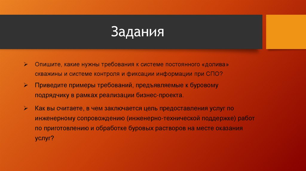 ЗаданияОпишите, какие нужны требования к системе постоянного «долива»