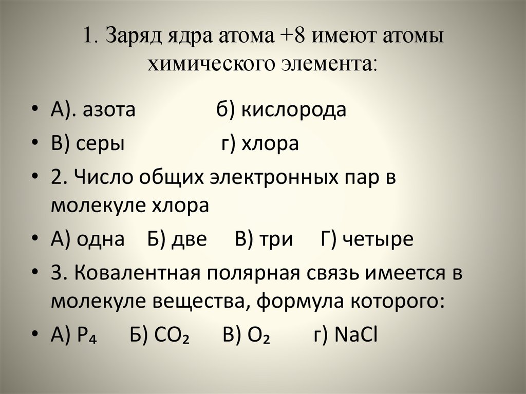1. Заряд ядра атома +8 имеют атомыхимического элемента: