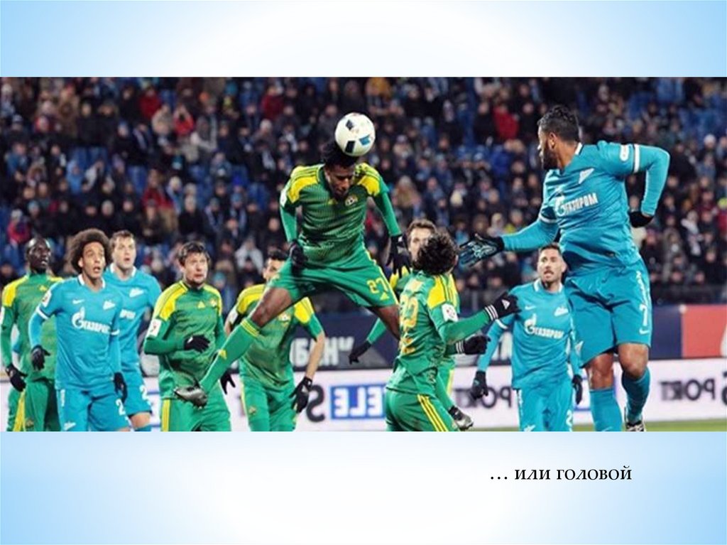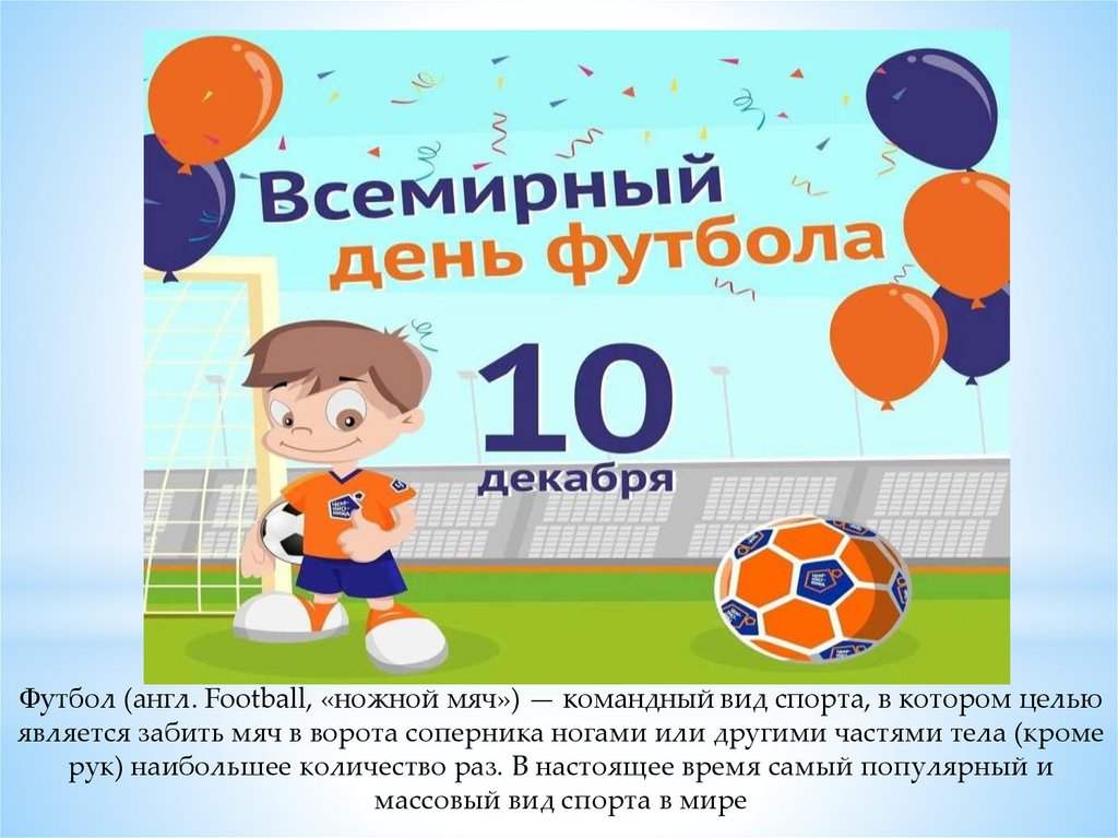 Футбол (англ. Football, «ножной мяч») — командный вид спорта, в котором цельюявляется забить мяч в ворота соперника ногами или другими частями тела (кроме