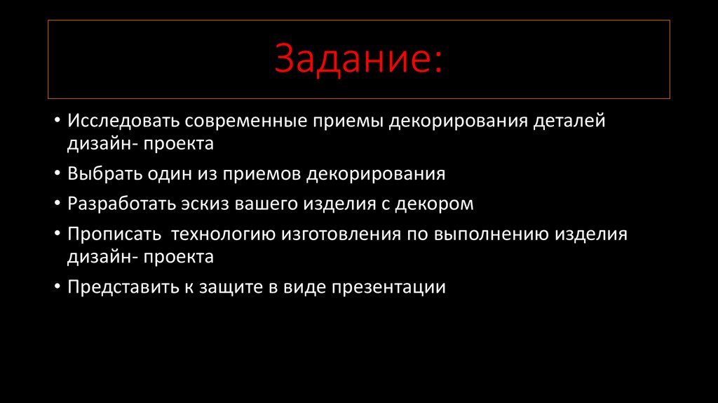 Задание:• Исследовать современные приемы декорирования деталей