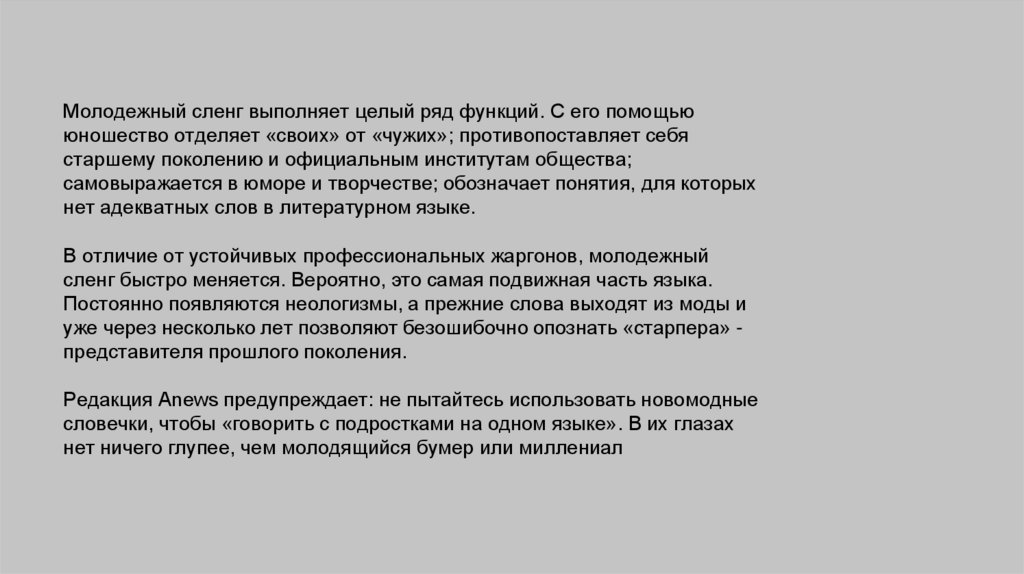 Молодежный сленг выполняет целый ряд функций. С его помощьююношество отделяет «своих» от «чужих»; противопоставляет себя