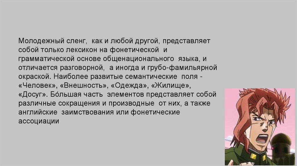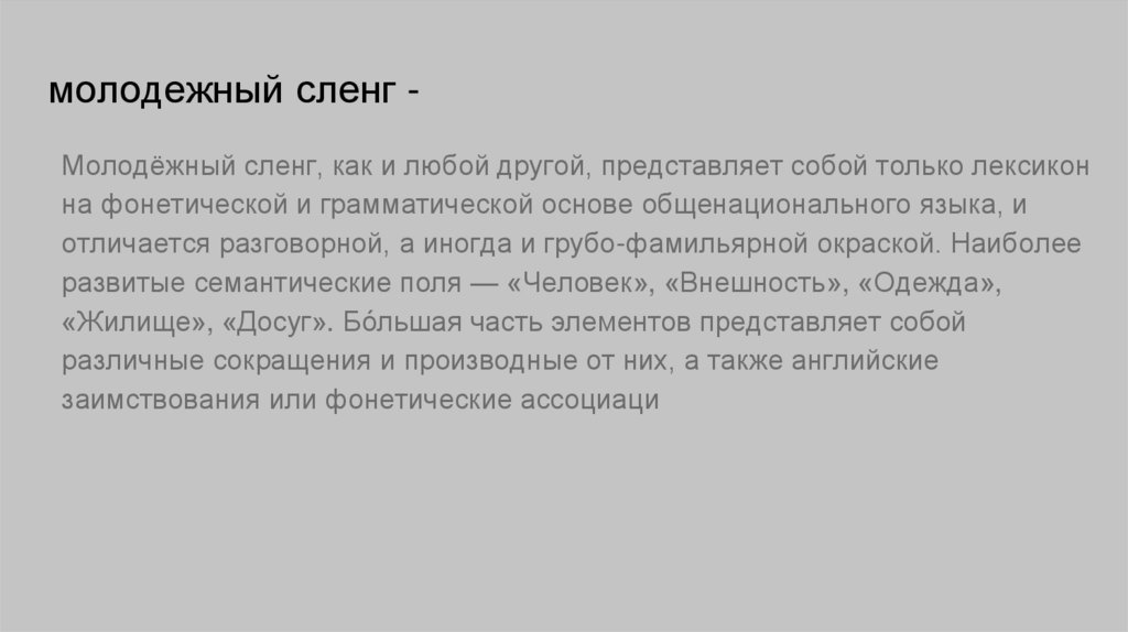 Молодежный сленг, как и любой другой, представляетсобой только лексикон на фонетической и