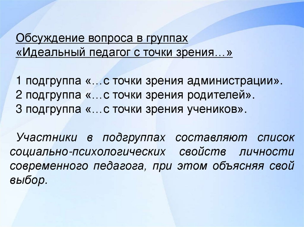 Обсуждение вопроса в группах«Идеальный педагог с точки зрения…»