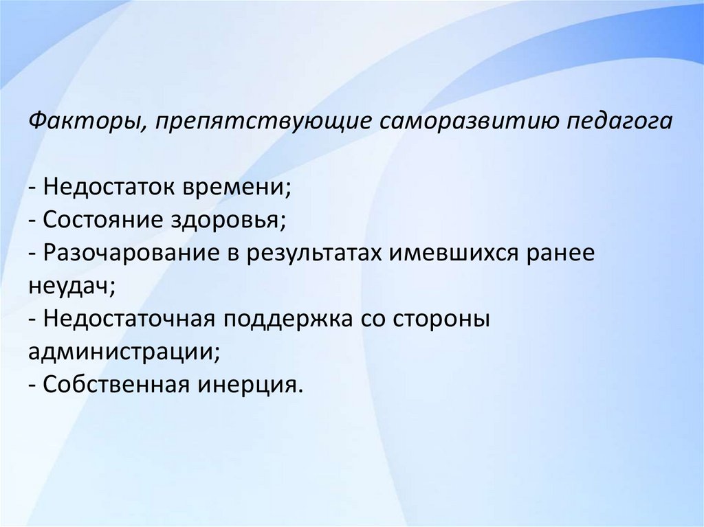 Факторы, препятствующие саморазвитию педагога- Недостаток времени;