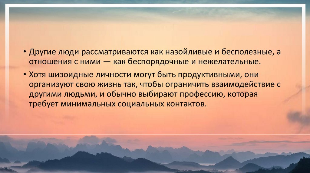 • Другие люди рассматриваются как назойливые и бесполезные, аотношения с ними — как беспорядочные и нежелательные.