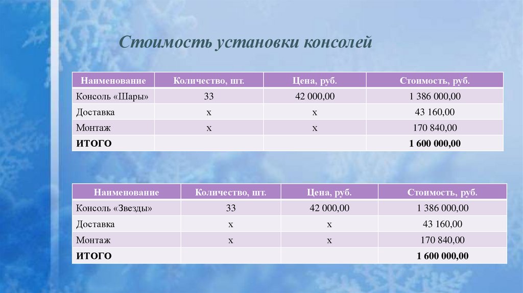 Стоимость установки консолейНаименование