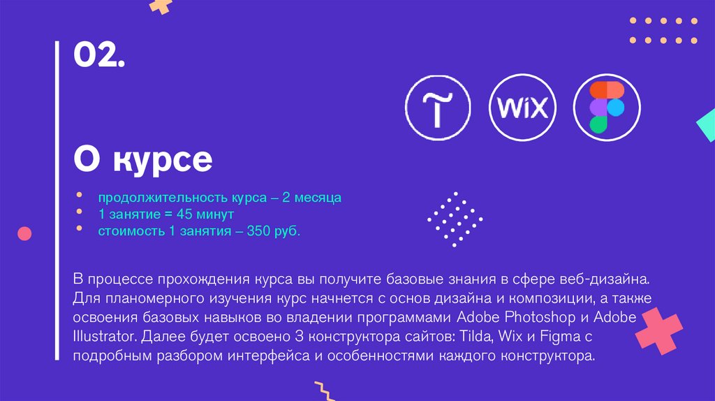 Illustrator. Далее будет освоено 3 конструктора сайтов: Tilda, Wix и Figma с