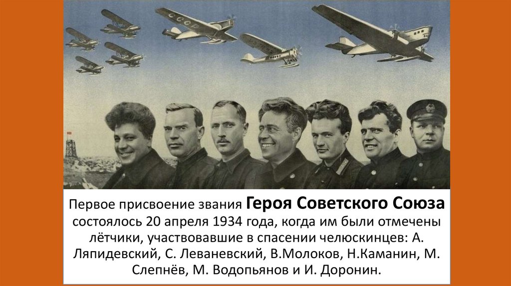 Первое присвоение звания Героя Советского Союзасостоялось 20 апреля 1934 года, когда им были отмечены