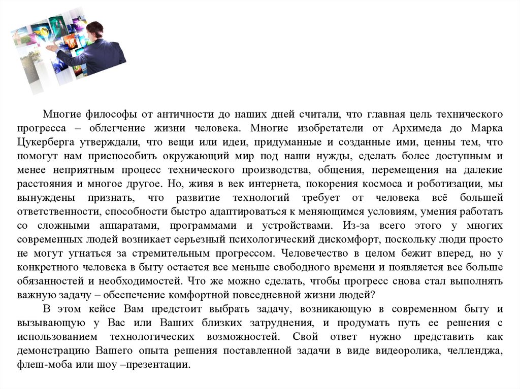 Многие философы от античности до наших дней считали, что главная цель техническогопрогресса – облегчение жизни человека. Многие изобретатели от Архимеда до Марка