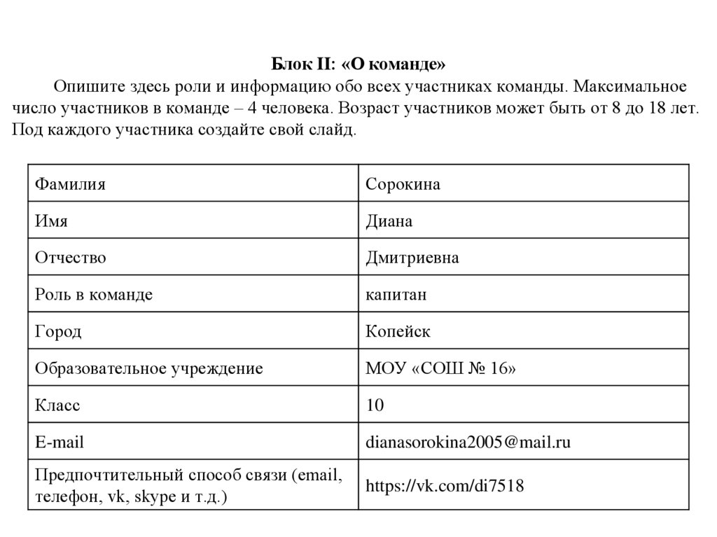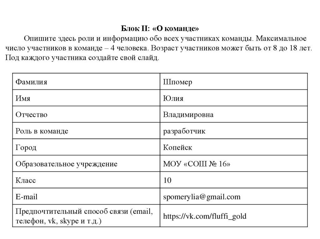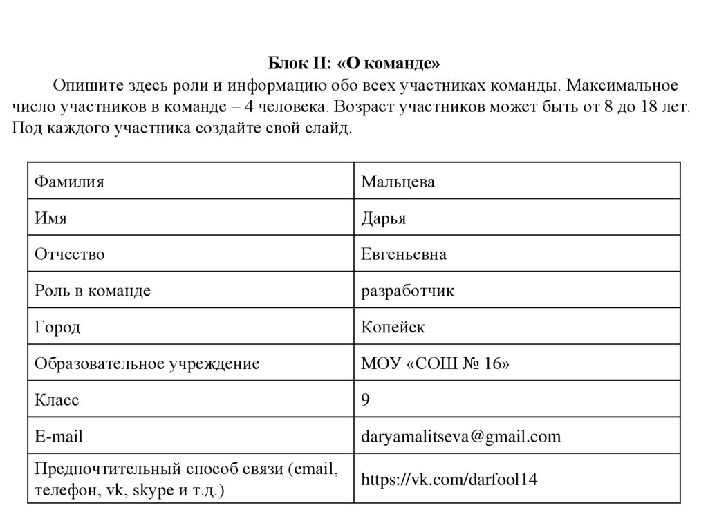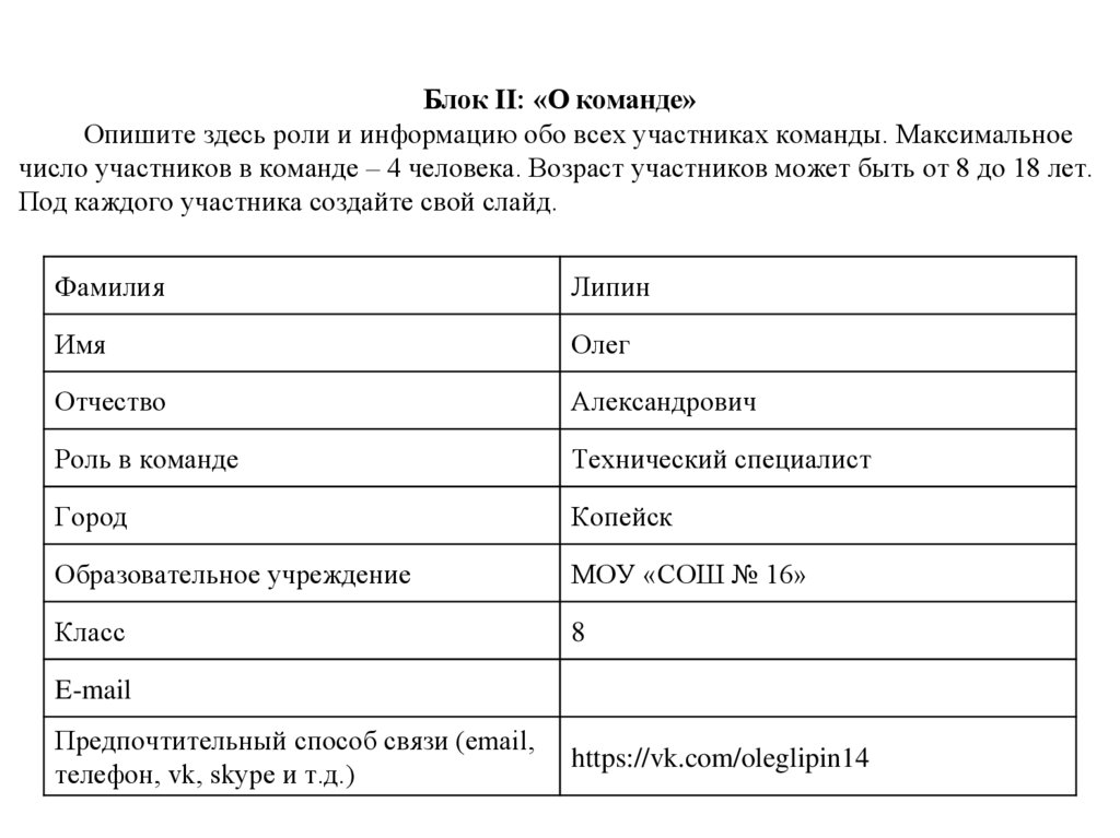 Блок II: «О команде»Опишите здесь роли и информацию обо всех участниках команды. Максимальное