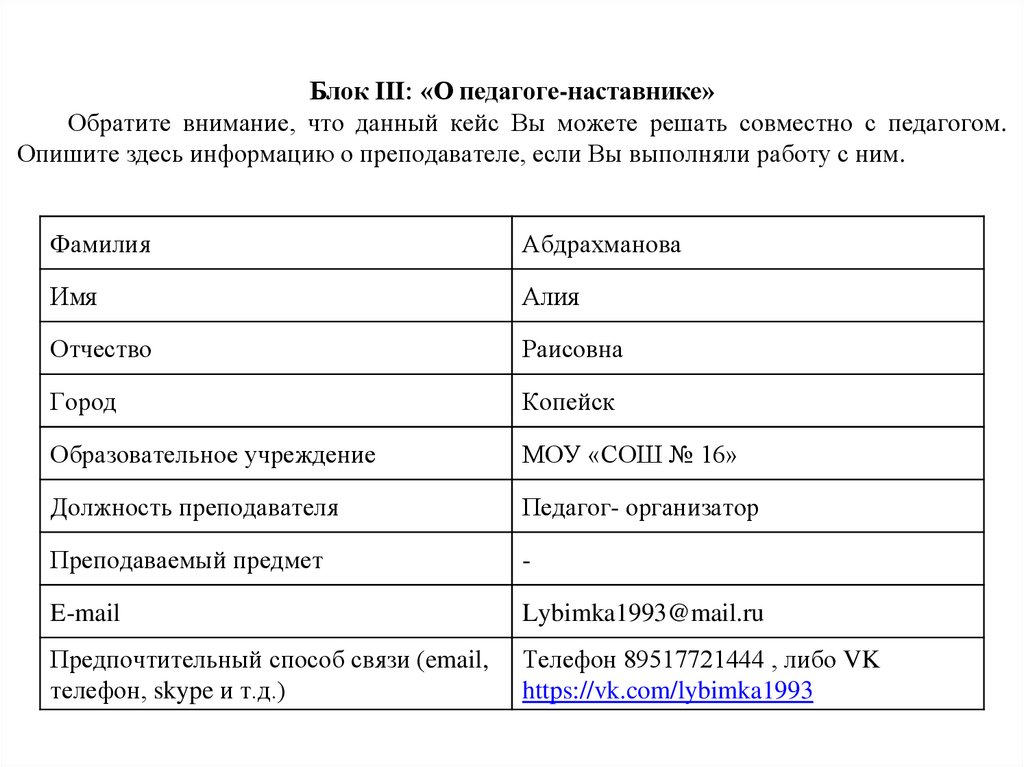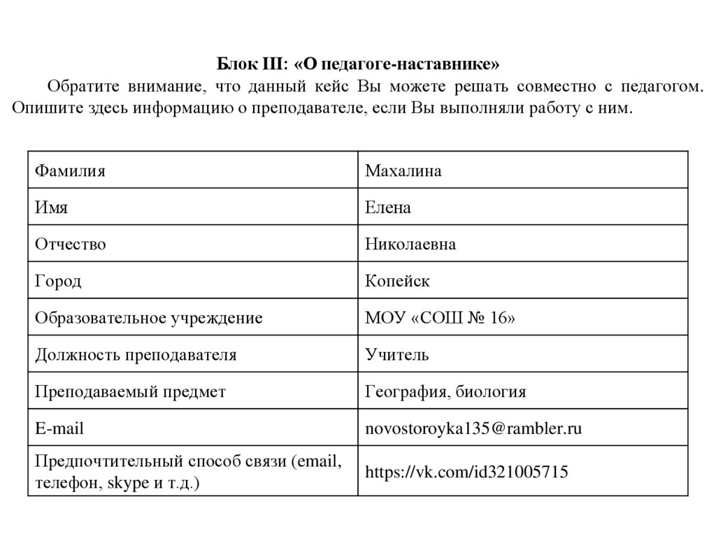 Блок III: «О педагоге-наставнике»Обратите внимание, что данный кейс Вы можете решать совместно с педагогом.