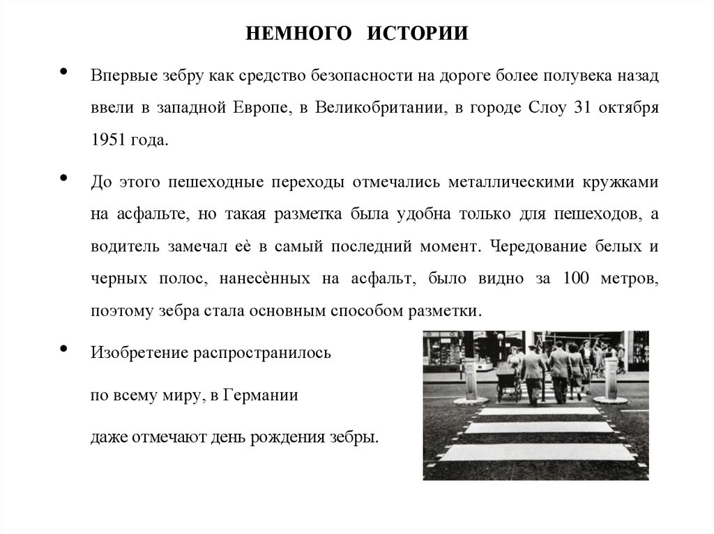 НЕМНОГО ИСТОРИИВпервые зебру как средство безопасности на дороге более полувека назад