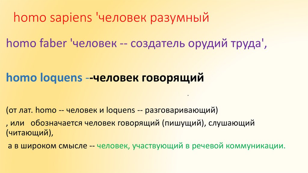 homo sapiens 'человек разумныйhomo faber 'человек -- создатель орудий труда',