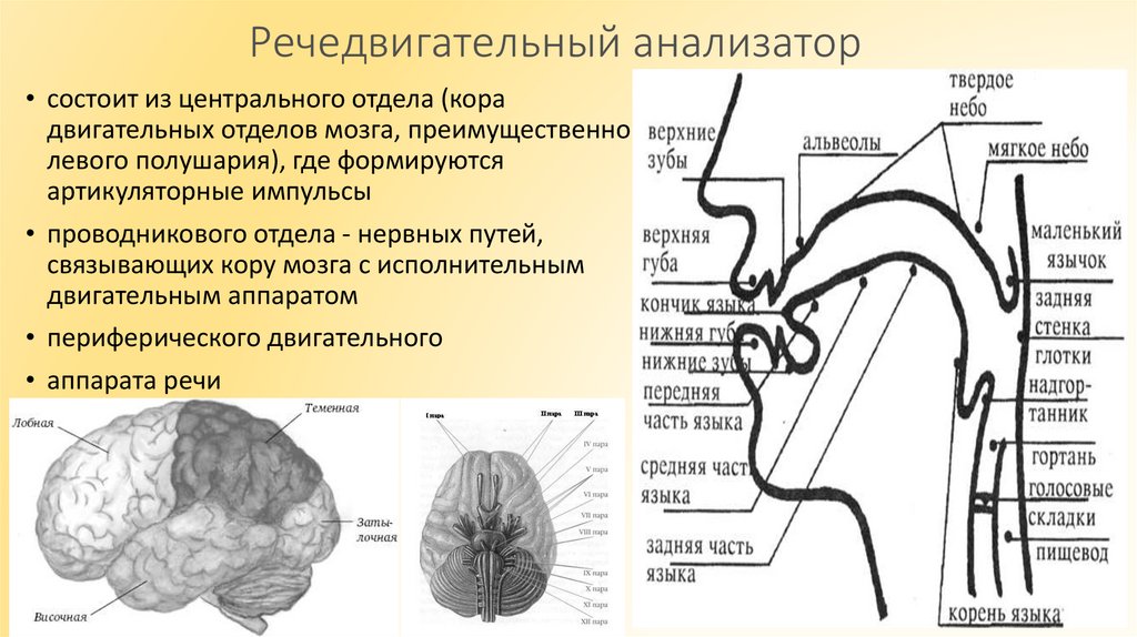 Речедвигательный анализатор• состоит из центрального отдела (кора