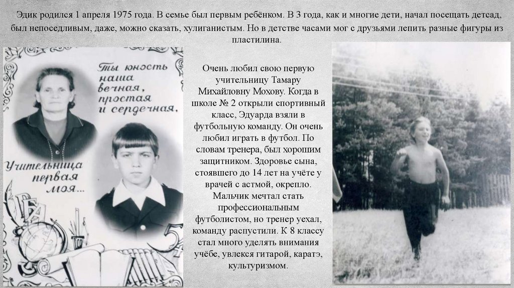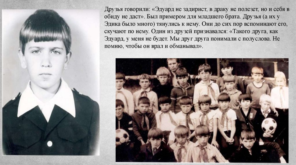 Друзья говорили: «Эдуард не задирист, в драку не полезет, но и себя вобиду не даст». Был примером для младшего брата. Друзья (а их у
