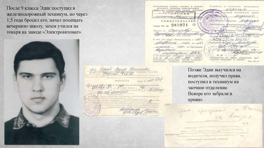 После 9 класса Эдик поступил вжелезнодорожный техникум, но через
