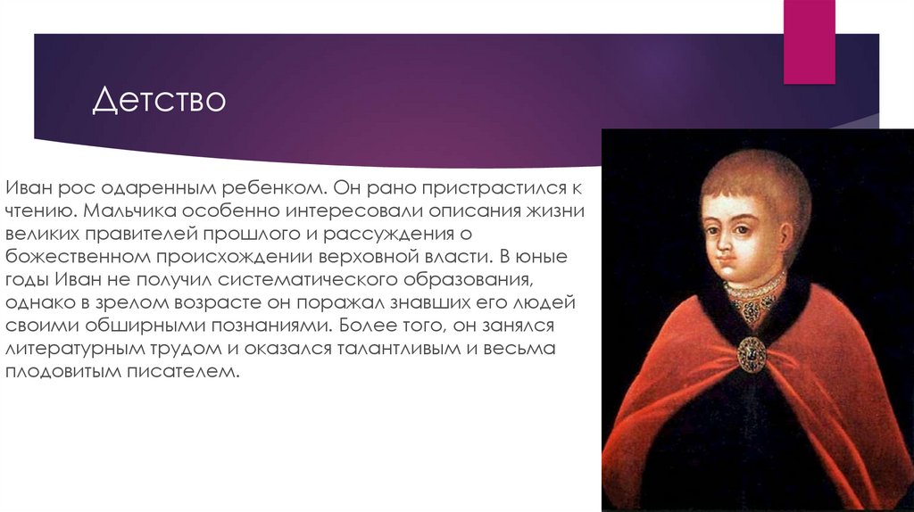 ДетствоИван рос одаренным ребенком. Он рано пристрастился к