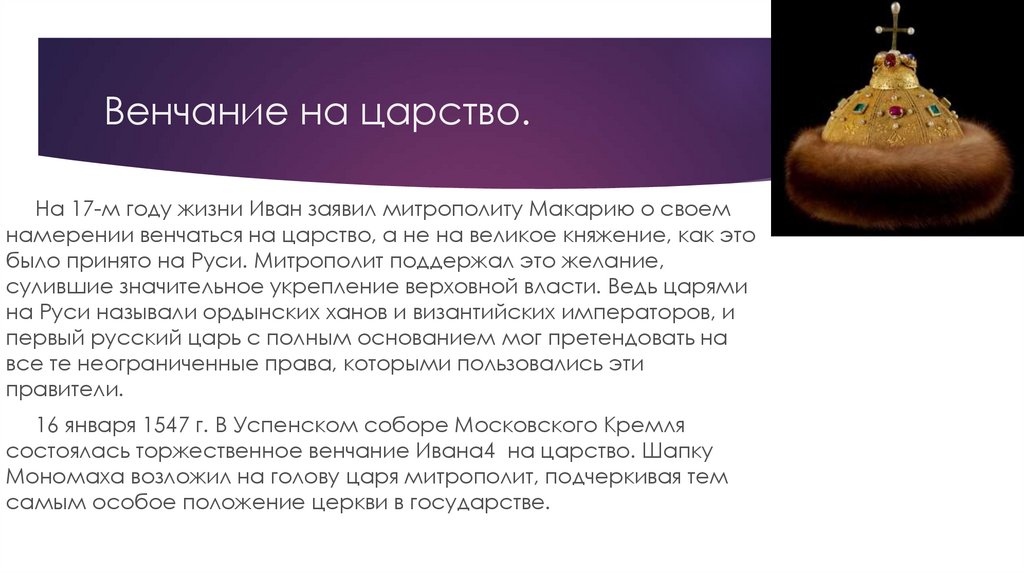 Венчание на царство.На 17-м году жизни Иван заявил митрополиту Макарию о своем